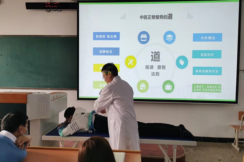 王轩作了题为《中医正骨整脊的道与术》的讲座。他通过正骨手法示范、临床应用实例,为同学们深入浅出地讲解了“大道至简”。讲座中,他强调要与患者多交流,医患合作才能获得最佳的诊治效果。